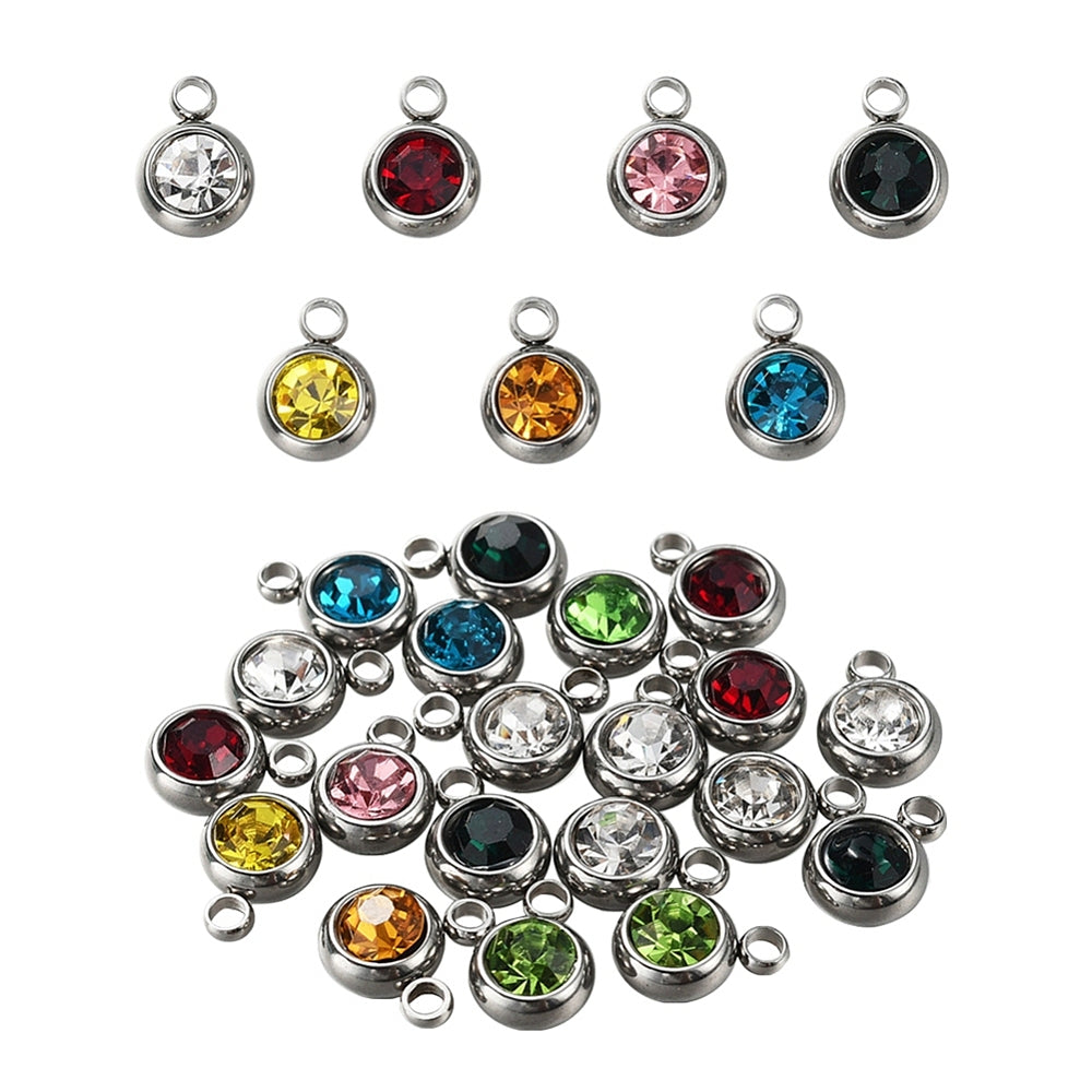 20pcs 303 Stainless Steel Rhinestone Charms – Flat Round Birthstone Necklace Charms, Mixed Colors