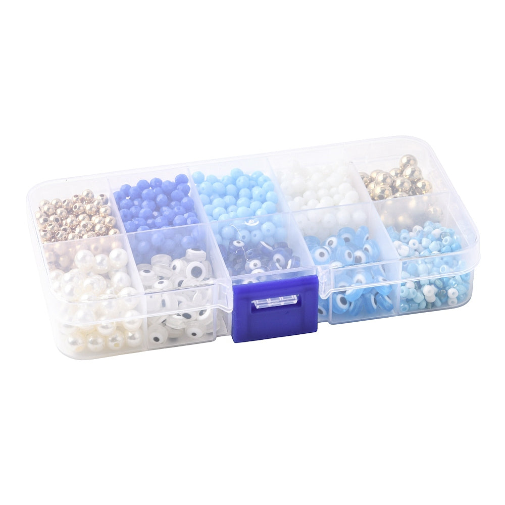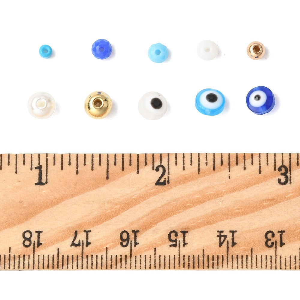 The kit includes 150 flat round resin evil‑eye beads, 600 glass beads, 8 g of seed beads, 245 CCB beads, and 50 imitation pearl beads, offering excellent variety and value in one convenient pack.