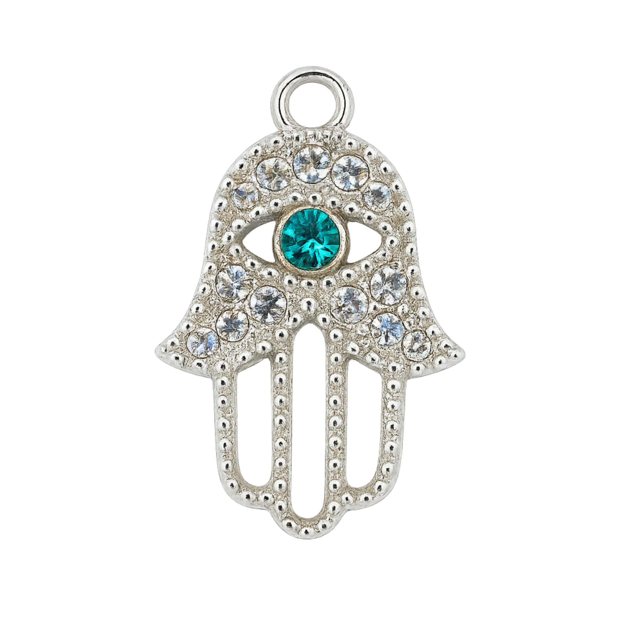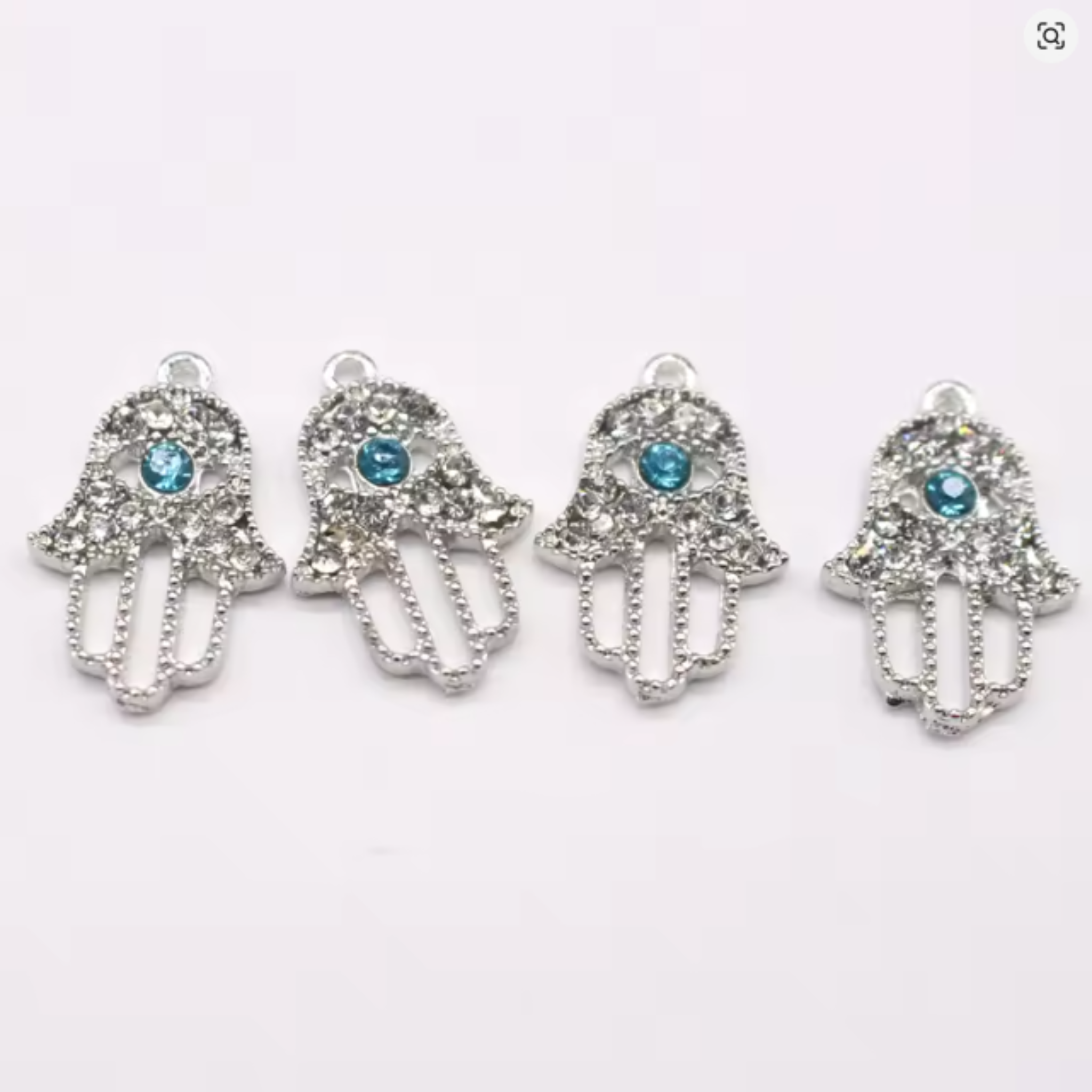 Silver Alloy Hamsa Hand Charm – Crystal & Blue Eye Pendant for DIY Jewelry (2.5cm)