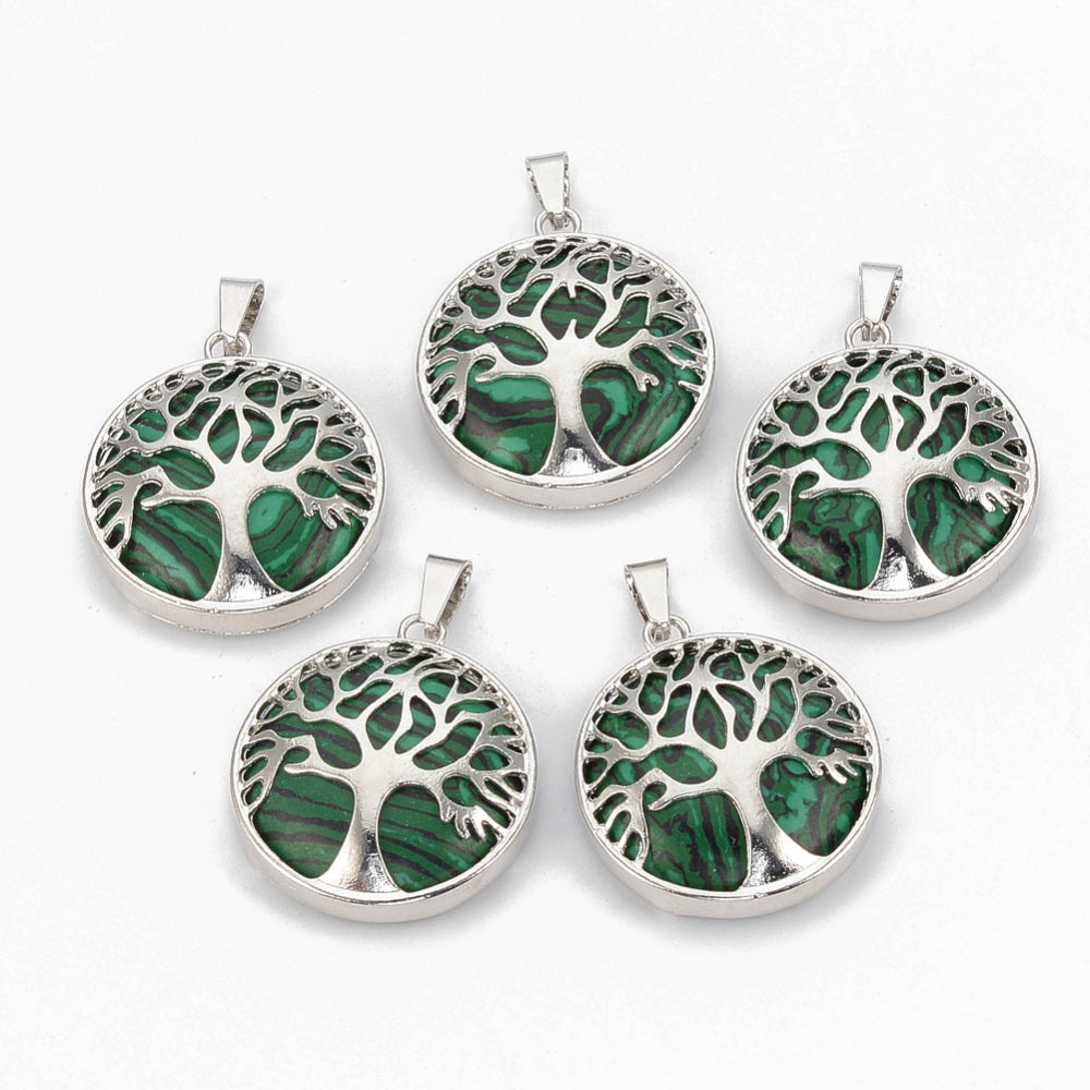 Synthetic Malachite Tree of Life Pendants – Flat Round with Brass Findings, Dyed Green, Platinum Finish